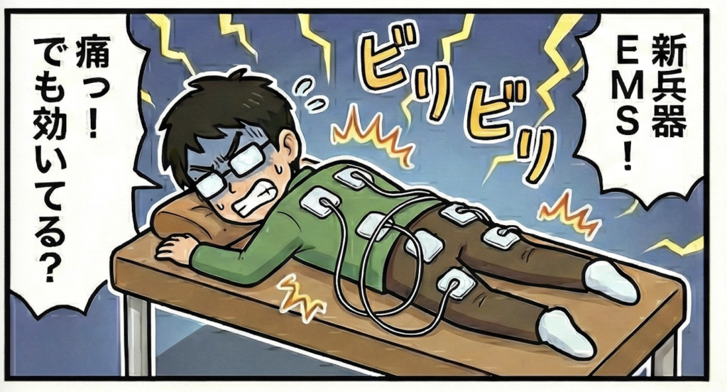 イーエムエス…?🤔 通販番組で見る、あのお腹に貼ってブルブルさせるやつ?📺