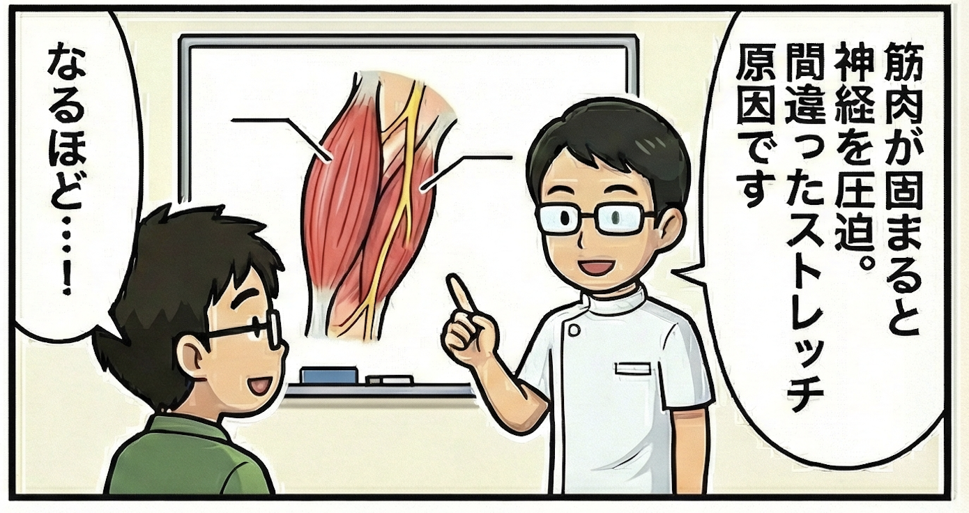そこで分かったのは、 「筋肉が固まると、神経を圧迫して痺れや痛みが出る」というシンプルな事実。