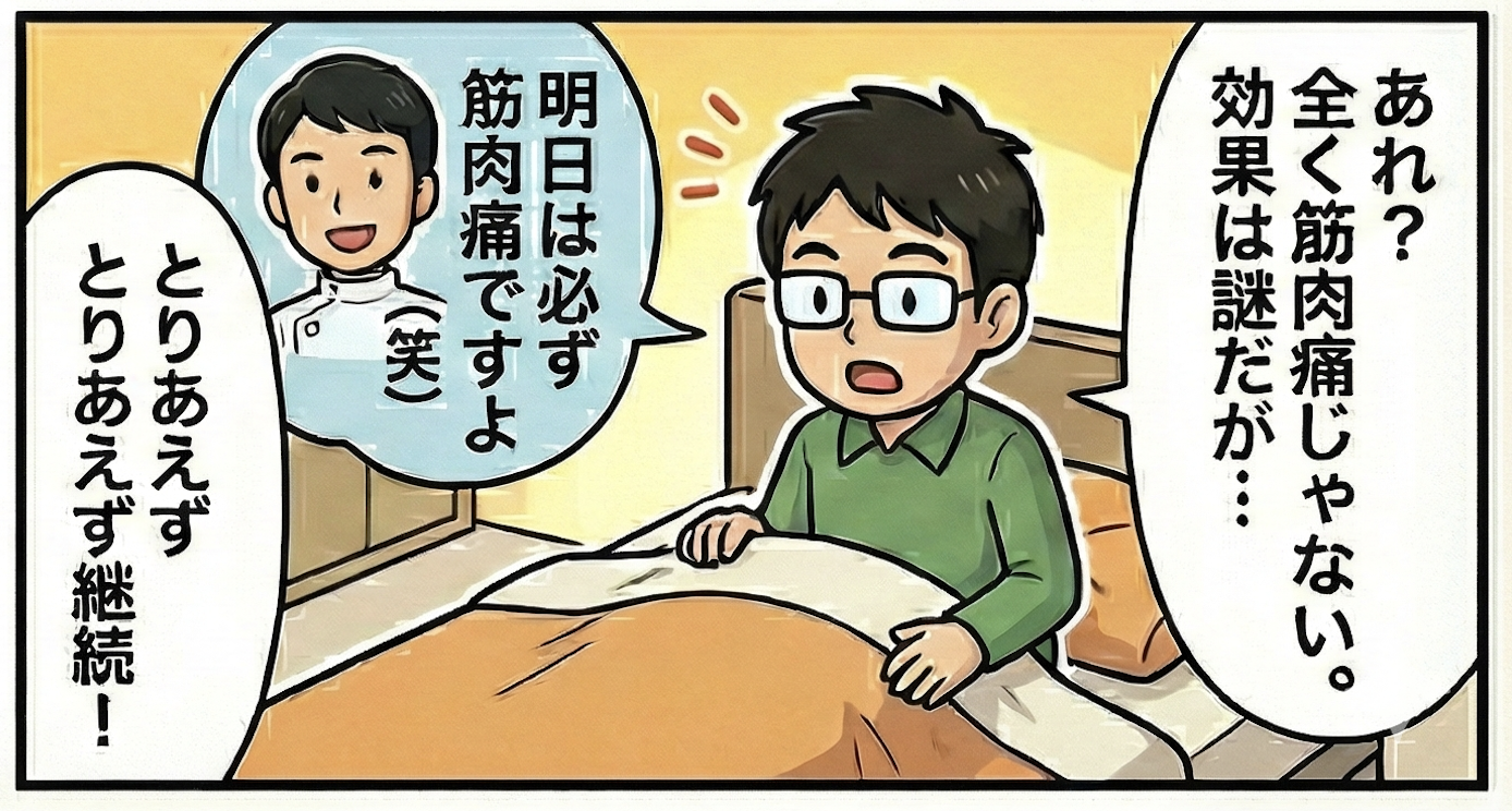施術後、先生がニヤリと笑って言いました。 👨⚕️「結構しっかりやったので、明日は必ず筋肉痛になりますよ。覚悟しておいてくださいね(笑)」