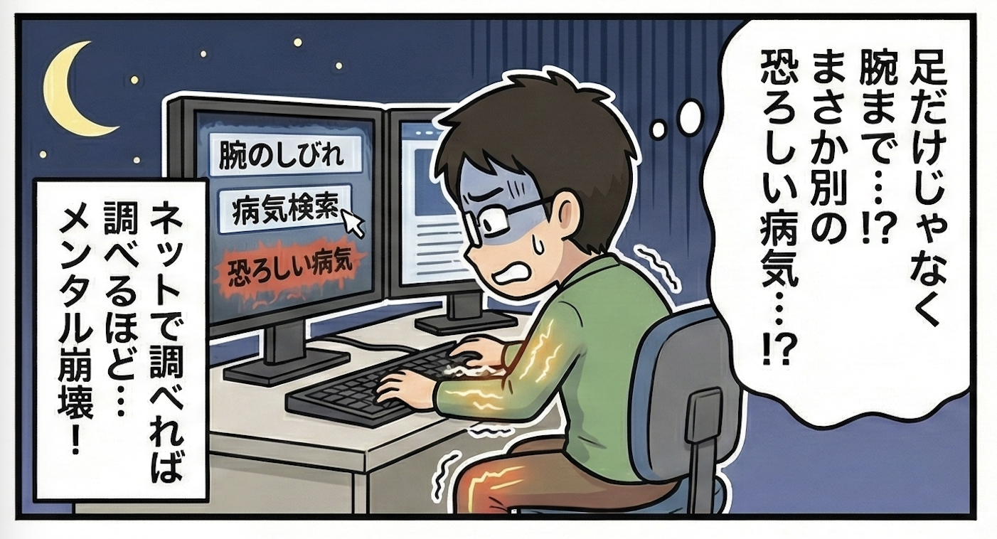 これ、坐骨神経痛じゃない別の恐ろしい病気なんじゃ?😨不安は爆発し、深夜までネットで病状を検索しまくる「検索魔」に📱💻