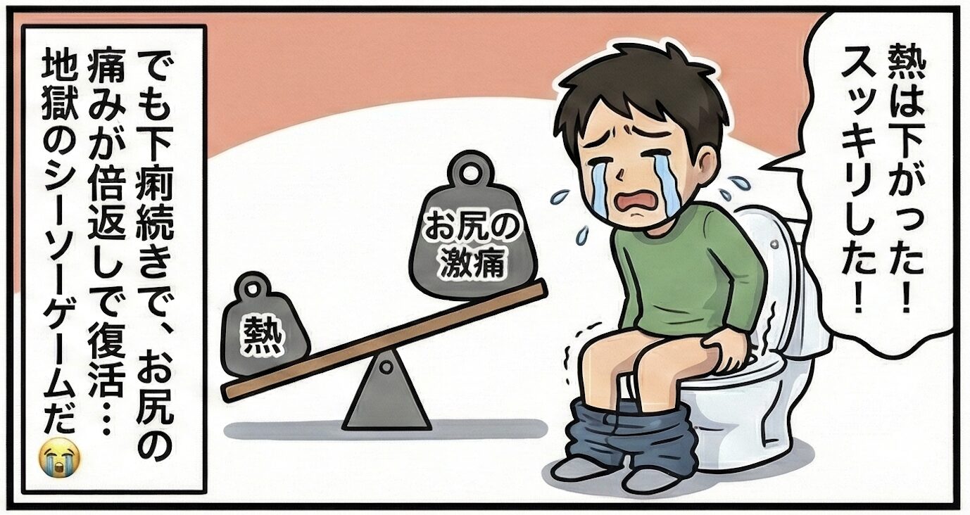 お尻の痛みが治りかけて「やっと元気になれる!」と喜んでいたのも束の間(つかのま)、今度は急にひどい下痢(げり)に襲われました😨