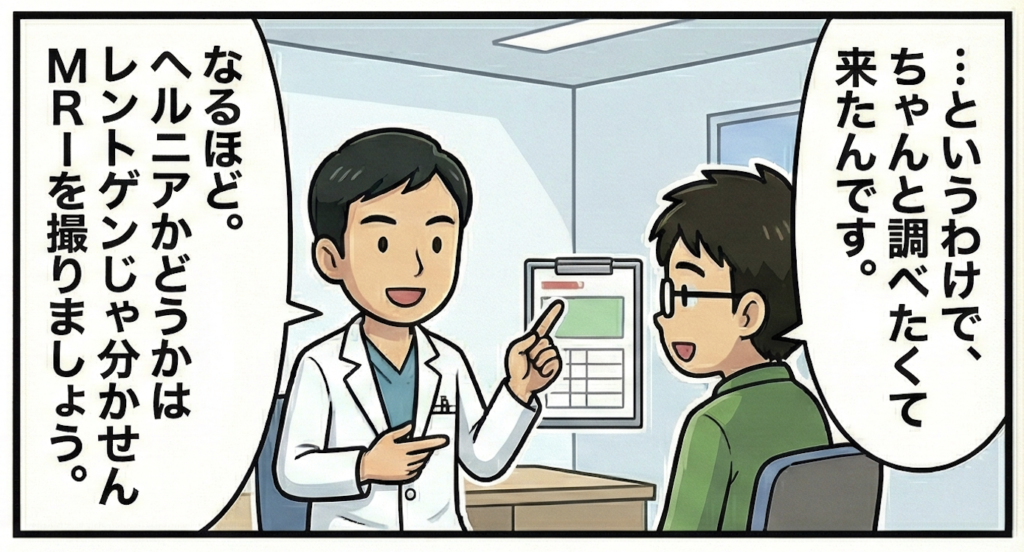 「ヘルニアかどうかは、レントゲンだけでは分かりません。MRIを撮りましょう」
