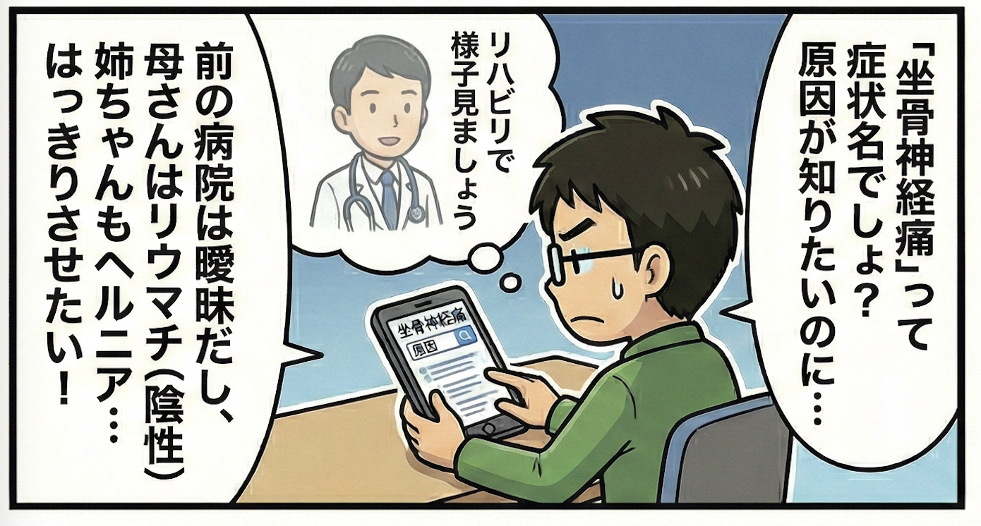 私が知りたいのは、**「なぜ坐骨神経痛が起きているのか?🤔」**という根本の部分。 特に、「私はヘルニアなのか、そうではないのか?」という点が、ずっと気になっていました💭